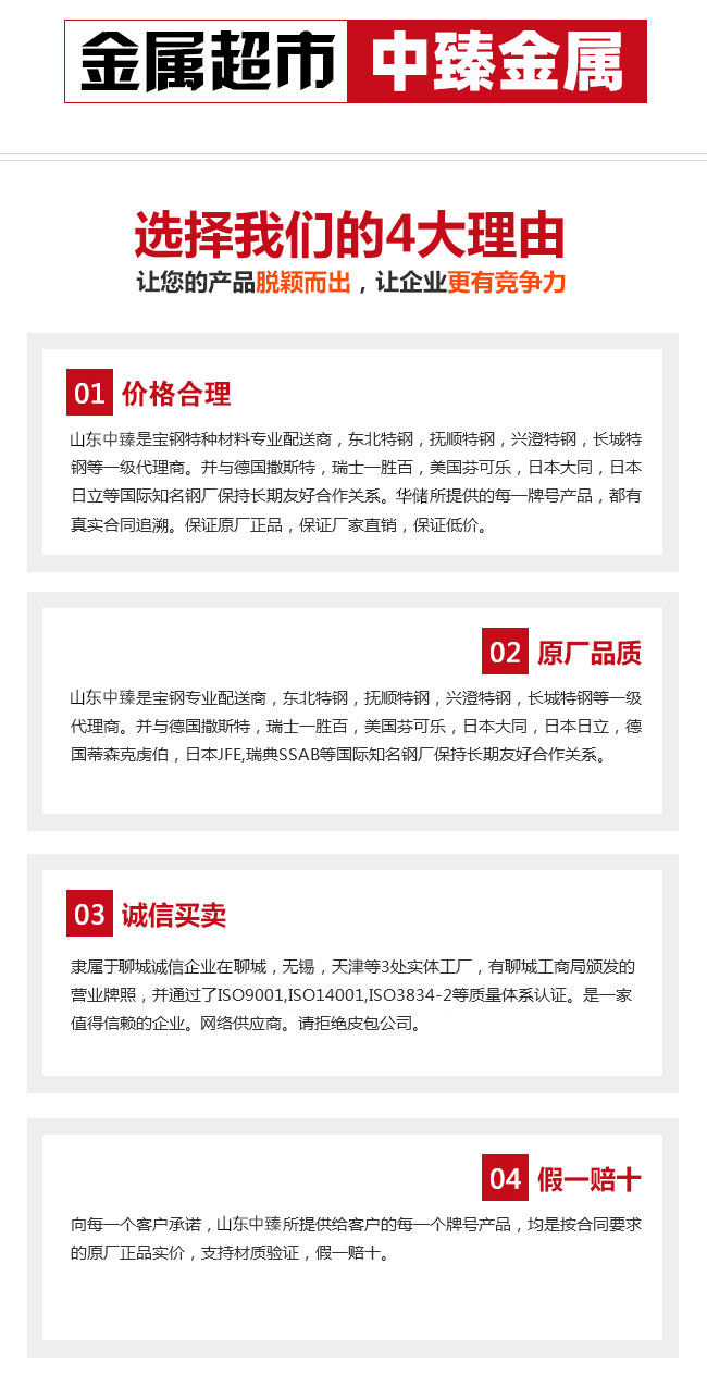 山東中臻是“優(yōu)質(zhì)鋼材一站式供應商”,山鋼集團,東北特鋼,撫順特鋼,長城特鋼,大冶特鋼等一級銷售商。中臻擁有聊城,無錫,天津三處實體工廠,常規(guī)備貨量達萬噸,規(guī)格齊全,每一所供牌號均有真實合同追溯。